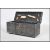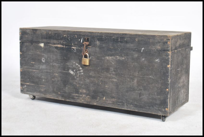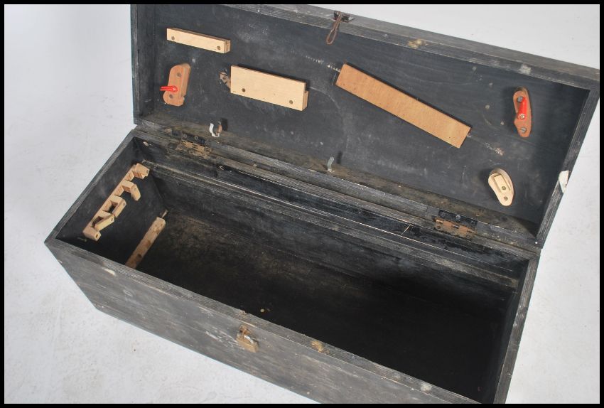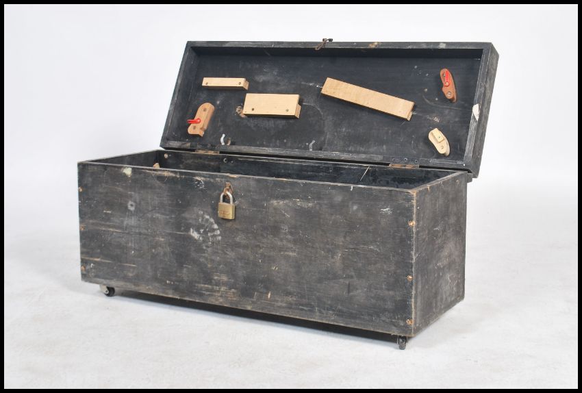 A vintage 20th century ebonised tool box having a hinged lid opening to reveal a spacious interior with fitted sides and lids, raised on castors. Measures: 43cm high x 92cm wide x 47cm deep.