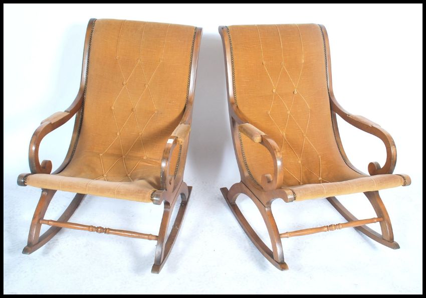 A pair of 20th century Regency revival mahogany rocking chairs having shaped arms and upholstered frames raised on angled legs with sleigh runners. Measures: 92cm high x 59cm wide.