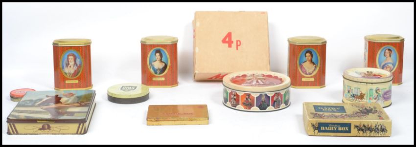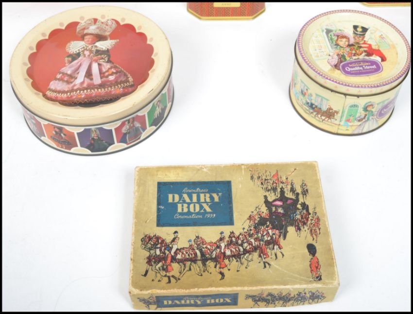 A collection of vintage 20th century advertising point of sale tins, to include four Rowntrees 1950s Monarch tins, Zubes, Opas, Mars bar shop tray box, Rowntrees dairy box, Pasal Murray mints, two Mcintosh tins etc. Please see images. Highest measures 14 cm.