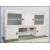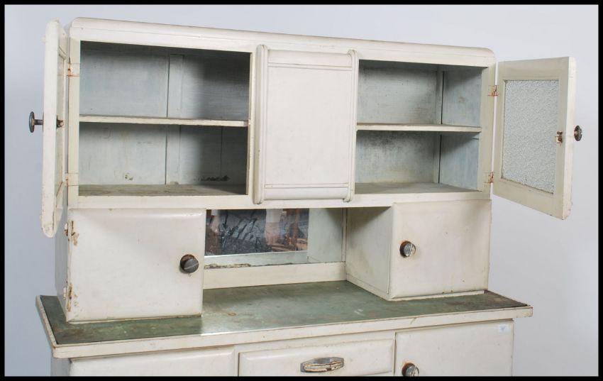 A 1930's Art Deco painted French kitchen dresser cabinet. The base with shaped bracket feet supporting a series of cupboards and short cupboard with central twin drawers. Above are glass cabinets with further cupboards and shelves. Dismantles into 2 pieces for ease of movement. Measures: 177cm high x 14cm wide x 52cm deep.