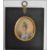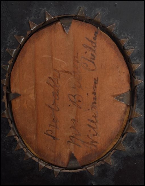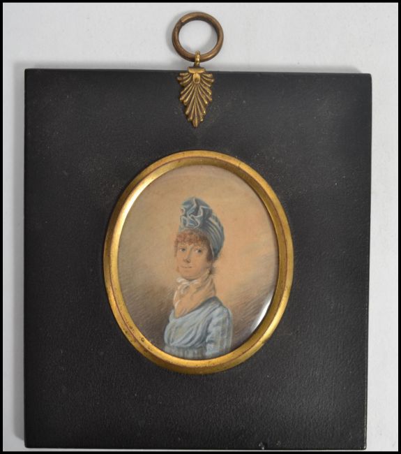 A 19th century Victorian watercolour and gauche portrait miniature tondo painting of a lady set to an ebonised square frame with gilt acanthus leaf bail to top and inscription to back. Measures 13 cm high and 12 cm wide.