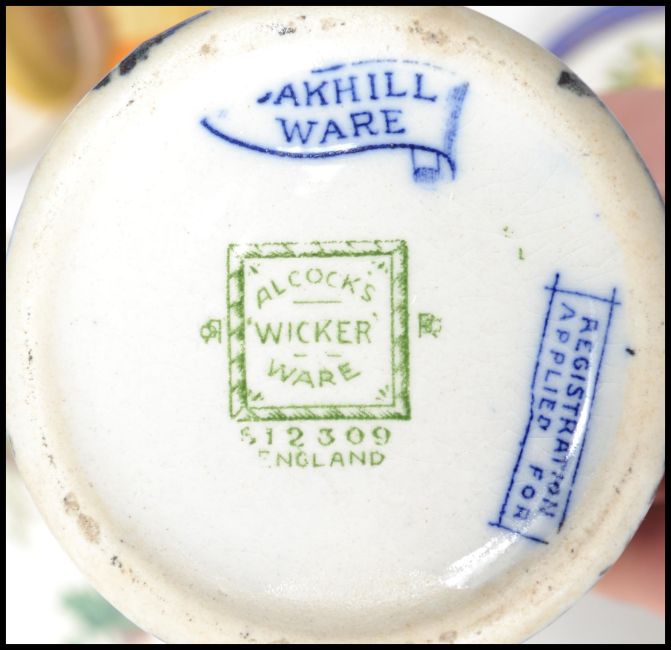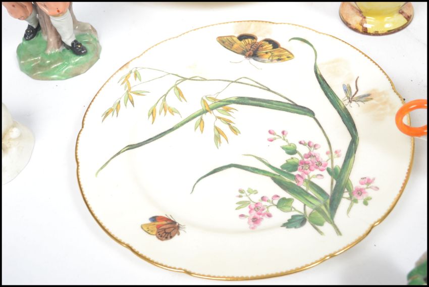 A collection of ceramics to include Minton aesthetic movement ceramic tazza cake stand and 2 matching plates being decorated with butterflies and flowers, Shelley drip glaze vase, Goebels figurine, Meissen style figurine having blue crossed swords marked to the base, other 19th and 20th century continental figurines, Alcock's wicker ware blue and white beaker, 2 Royal Doulton series ware plates to include Bill Sykes and another etc. Highest measures 21 cm and 27 cm diameter.