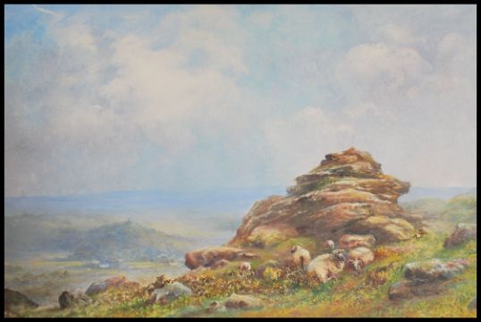 J A Moyle oil on board on painting of Dartmoor depicting sheep on a grassy hillside. Signed by artist to corner. Set in a large ornate gilt wooden frame. measures 50cm x 78cm