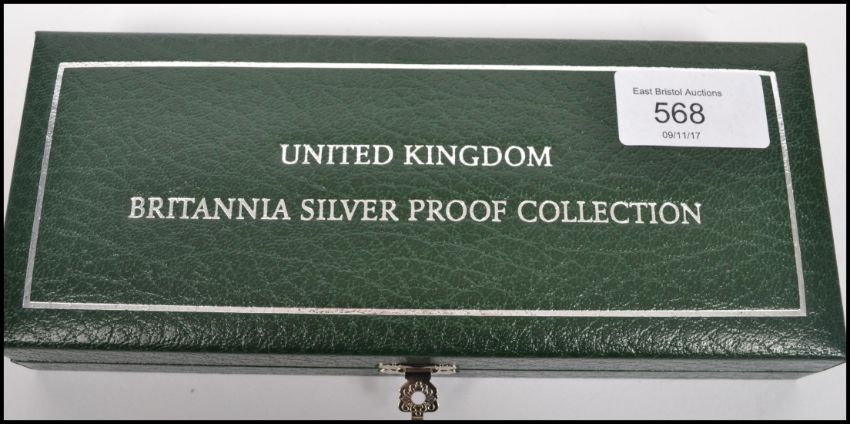 A Royal Mint United Kingdom 1998 silver proof Britannia Collection comprising: 20p; 50p; £1 and £2 coins, in original fitted box, with certificate of authenticity. Closed measures 3 cm high, 21 cm wide and 8.5 cm deep.