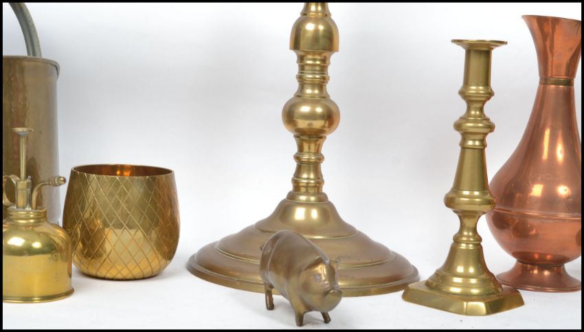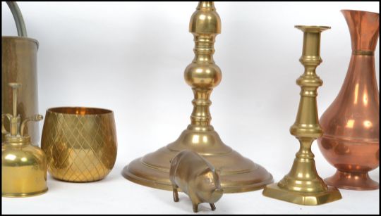 A collection of vintage 20th century brass and copper wares to include a large jardiniere planter on stand, ewer jugs, Pineapple ice bucket, brass novelty pig etc. Please see images. Highest measures 60 cm.