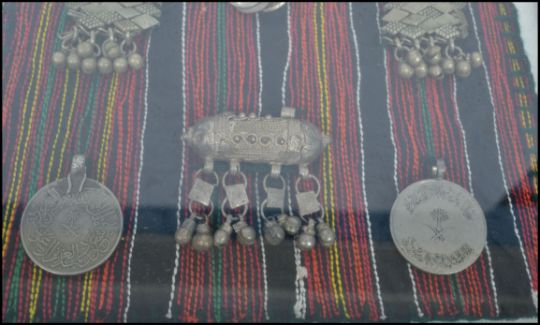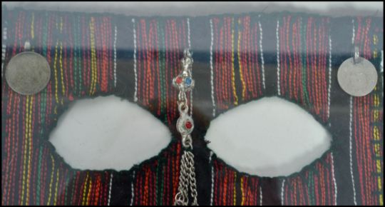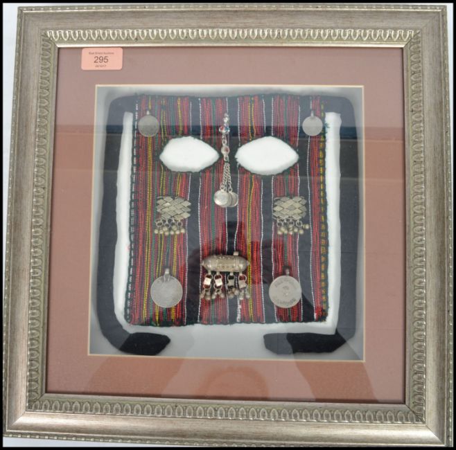 A framed and mounted fabric face veil of probable North African origin, the veil constructed from woven fabric and adorned with white metal decorations, two holes for eyes to centre. Measures: 40cm high x 40cm wide.