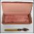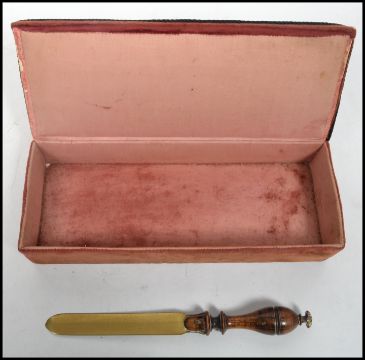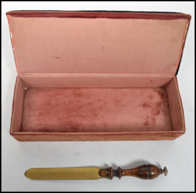 A brass and turned wood letter opener along with a pink cotton velvet letter box. Box measures 6 cm high, 32 cm wide and 13 cm deep.