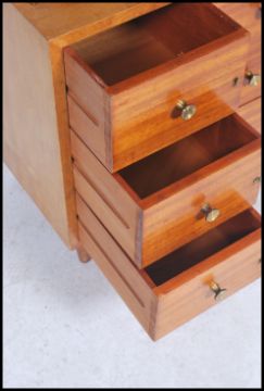 An unusual early 20th century Industrial office filing index cabinet raised on tapering legs having a bank of drawers beneath a suspended leather tooled writing top. Measures 74cm x 52cm x 38cm.