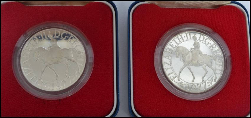 A pair of Royal Mint 1977 silver proof crown coins complete in original boxes along with two 1951 boxed festival of Britain coins. Largest box when closed measures 2 cm high, 8 cm wide and 8 cm deep.