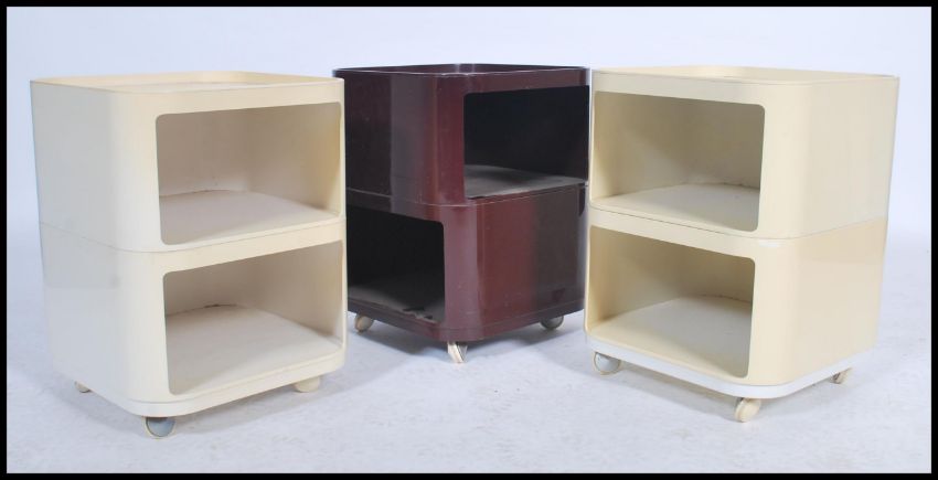 A set of three vintage retro 20th century Kartell Castelli stacking storage cupboards, two in white and one in brown. Measures 73cm x 145cm x 91cm.