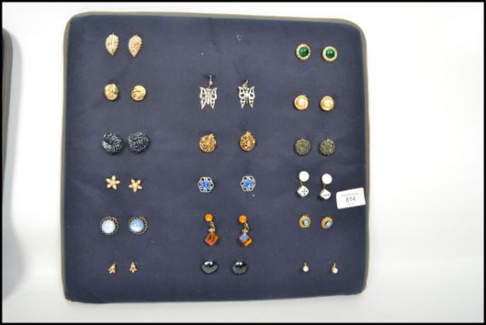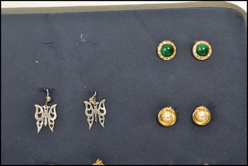 a collection of 17 pairs of costumer dress jewellery earring pairs to include jet, gilt, rhinestone, pictorial etc.
