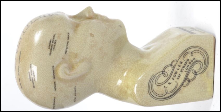 A Ceramic Phrenology Head / crackle glaze cream ceramic bust, marked ' Phrenology By L. N. Fowler '. Measures 16 cm high, 7 cm wide and 5 cm deep.
