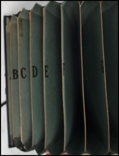 An early 20th century industrial Shriften Ordner expanding file having German lettering with sectional alphabetised interior and original ribbon tie. When closed measures 28 cm high, 19 cm wide and 7 cm deep.