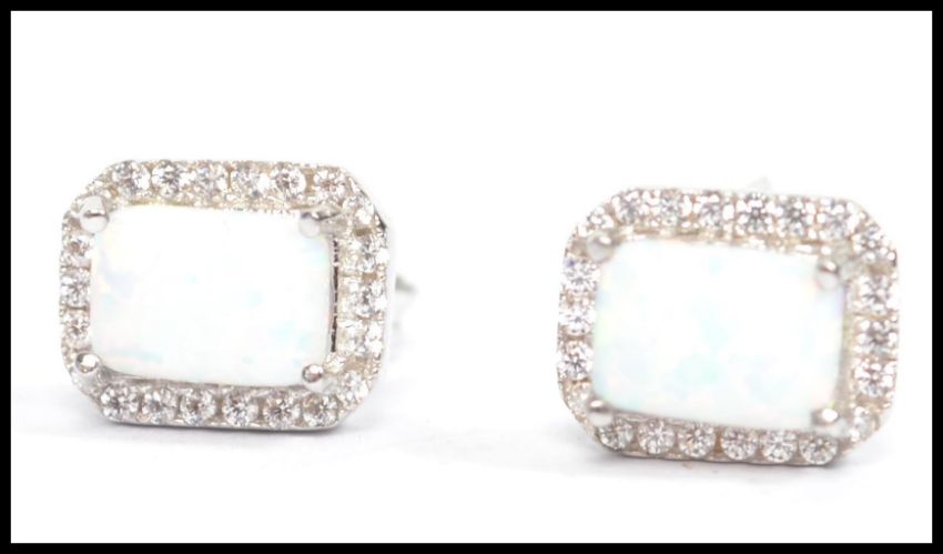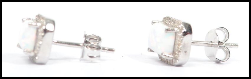 A pair of ladies silver and opal earrings. The opals on prong settings complete with post backs in the presentation case. Weight 3g Measures: 0.5cm long x 0.5cm wide.
