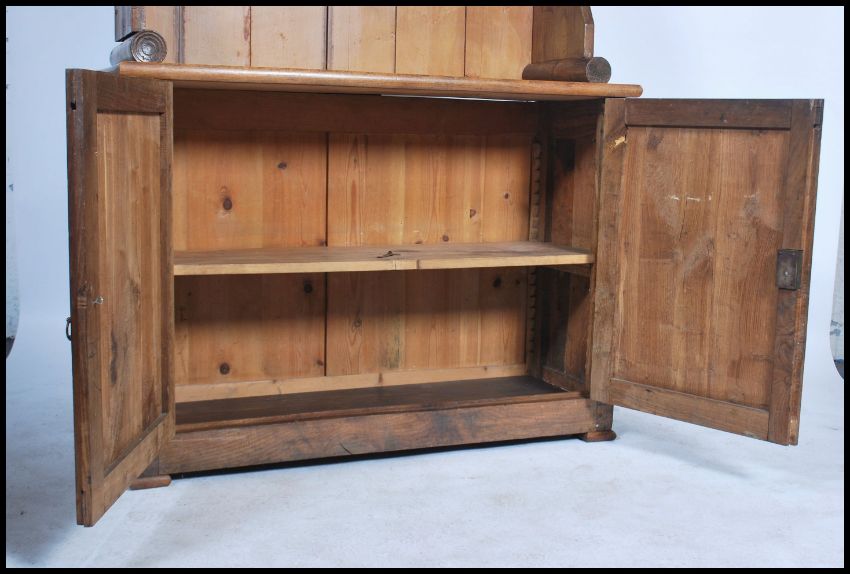 A 19th century large French country oak dresser raised on a plinth base with cupboards to base having an upright gallery back ( dismantles into 2 pieces for ease of movement ) Measures: 185cm high x 123cm wide x 45cm deep. The measurements are 184cm x 123cm x 45cm.