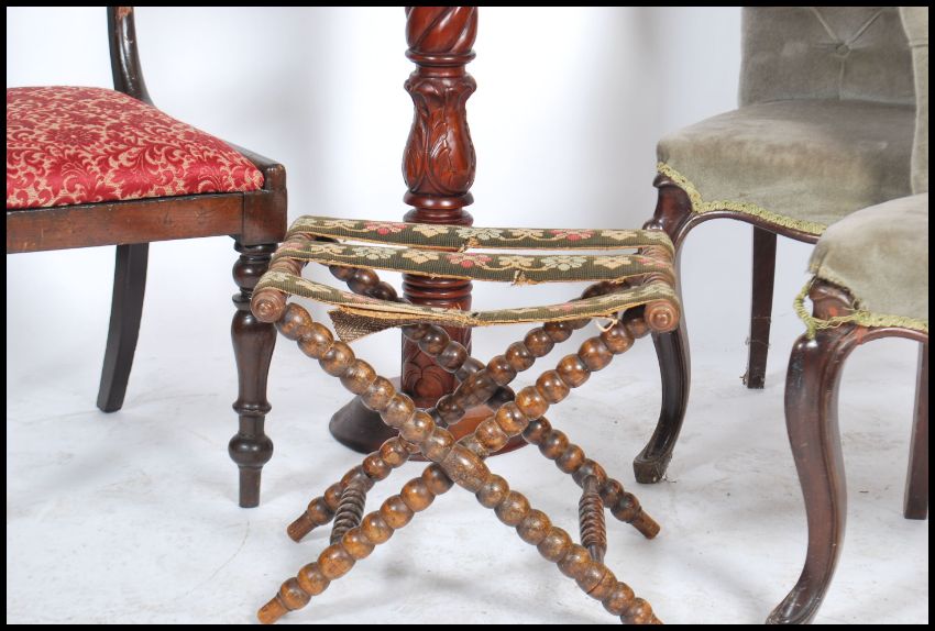 A 19th century bobbin turned folding coaching stand together with a Regency mahogany bar back dining chair, 2 Victorian button backed rococo dining chairs and a reproduction mahogany barleytwist torchere