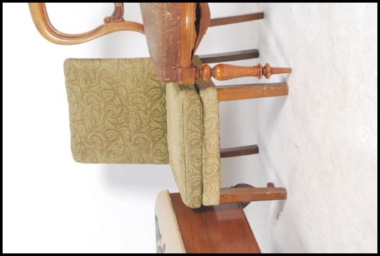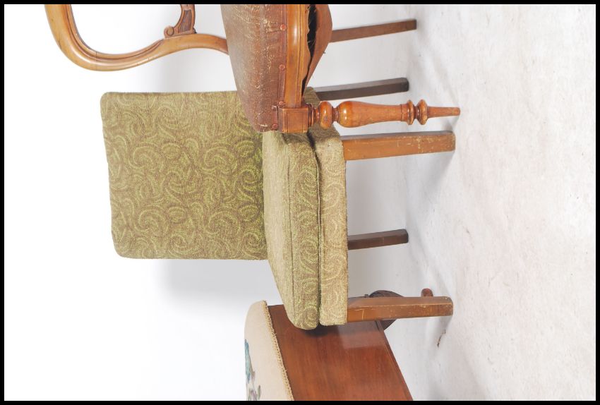 A 1930s tapestry covered topped blanket box / chest raised on cabriole legs together with a 19th century balloon back dining chair and another chair. Measures 45cm x 90cm x 40cm.