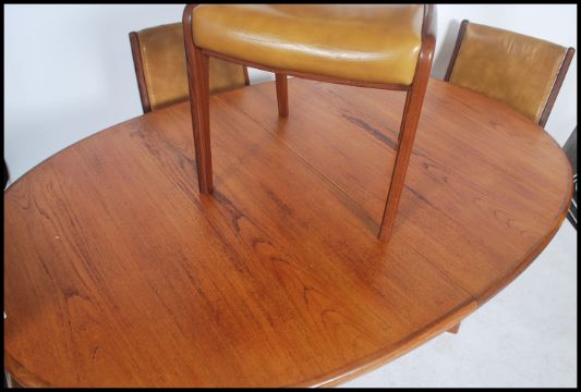 A 1970's G Plan teak extending dining table. Raised on tapered legs with a fitted frieze. Above an extending table top together with a matching set of 4 dining chairs with leather seats and backrests. measures 71 x 162 x 106