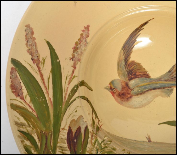 A 19th  century aesthetic movement hand painted decorative wall charger, the centre of the bowl decorated with a swallow in flight surrounded by water lilies and rushes. Impressed stamp to the verso for Minton,  circle within a triangle dating to 1886. Measures 9 cm high and 44 cm diameter.