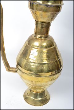 A 20th century Islamic / Indian brass large floor standing coffee pot of banded form having a shaped spout with bird head end and bird finial to top. Measures 100 cm high.