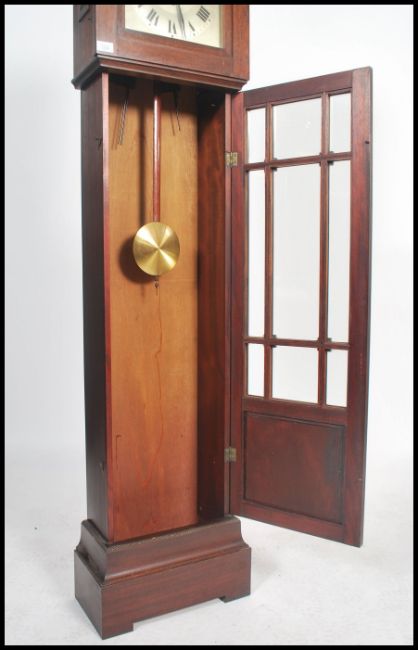 A 1920's tall oak cased longcase clock / grandfather clock with 31 day Westminster chime movement. The oak cased with sectional trunk window, silvered dial with roman numeral chapter ring. Measures 182cm high.