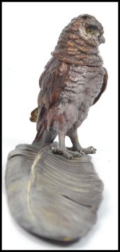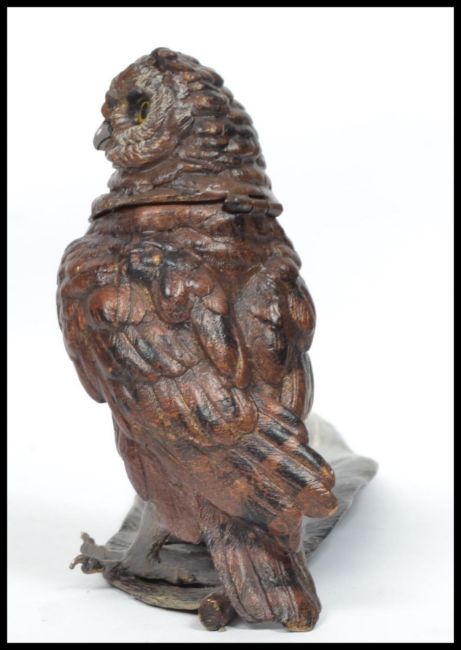 An impressive and unusual cold painted bronze owl on feather inkwell being signed to the base. Measures 14 cm high, 35 cm wide and 7 cm deep.