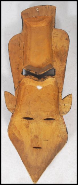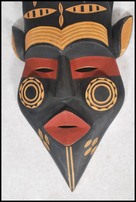 A 20th century large African tribal art wall mask of colourful decorative elongated form having twin face masks to each with pierced eyes. measures 117 x 43