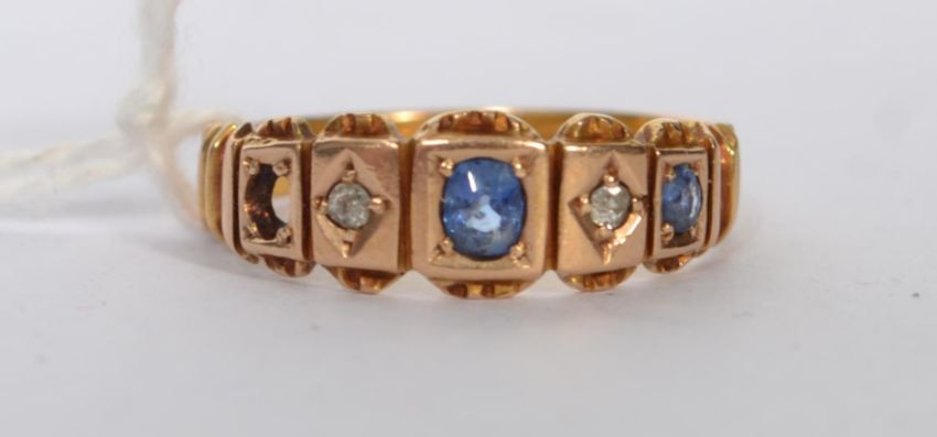 A 19th century hallmarked 15ct gold ring having a row of diamonds and sapphires in square mounts, hallmarked for Chester makers CR, weighs 2.9 grams.