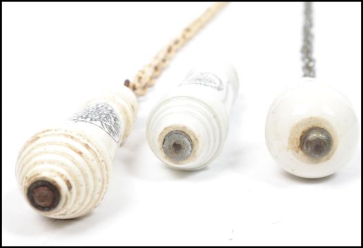 A group of three 19th century ceramic toilet pull handles one with notation for Plumton Cullompton and Son Sanitary Engineers, Plumton Cullompton and Son Plumbers and another. Longest handle (inc. pull chain/cord) measures 11 cm.