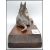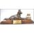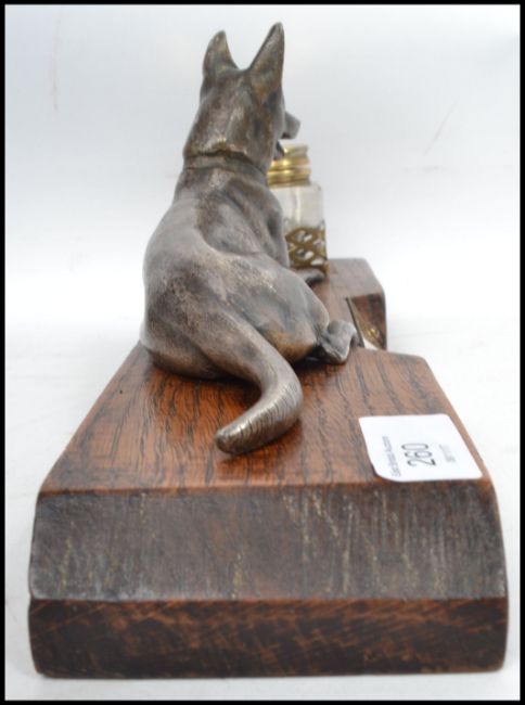 An early 20th century inkwell mounted on a wooden plinth with large cast figure of an Alsatian dog in an alert down position with applied plain brass name plaque to centre. Measures 14 cm high and 33 cm long.