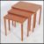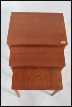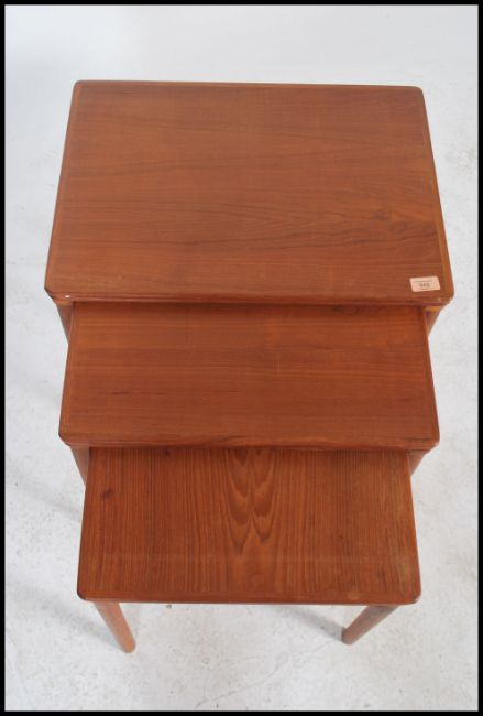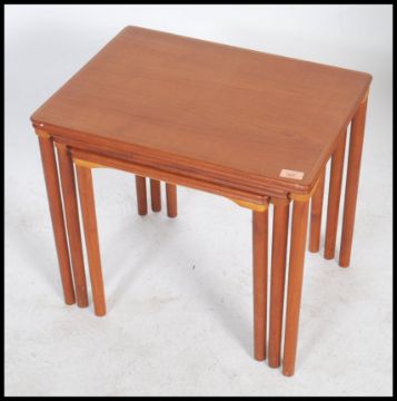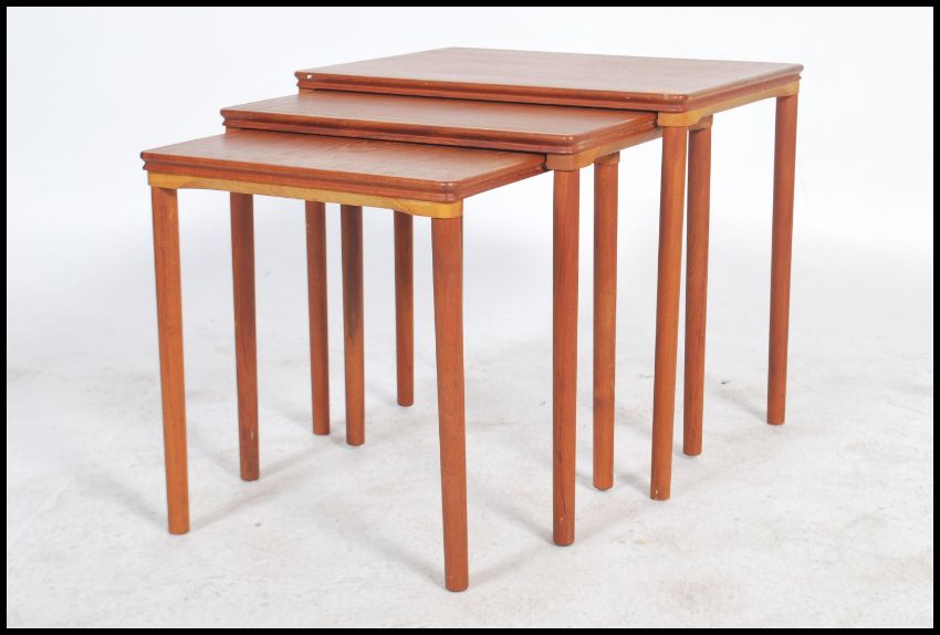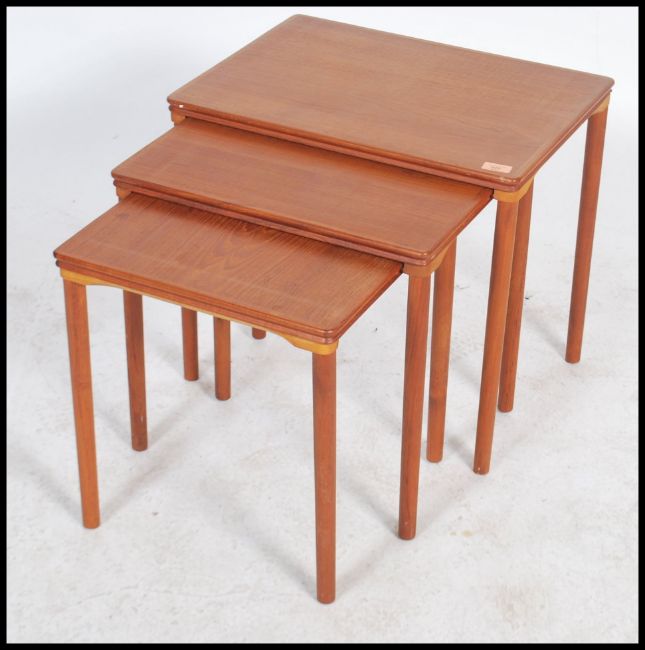 A good Danish 1960's teak wood graduating nest of tables being raised on turned legs with a series of graduating size table tops with reeded edge details, each table top sliding into tongue and groove recess