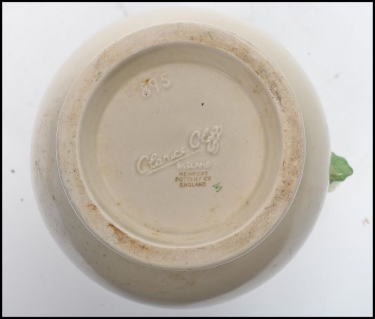 A Clarice Cliff pottery jug of baluster form, shape 895, with painted and moulded floral handle, Newport Pottery mark. Measures 23 cm high, 16 cm wide and 22 cm deep.