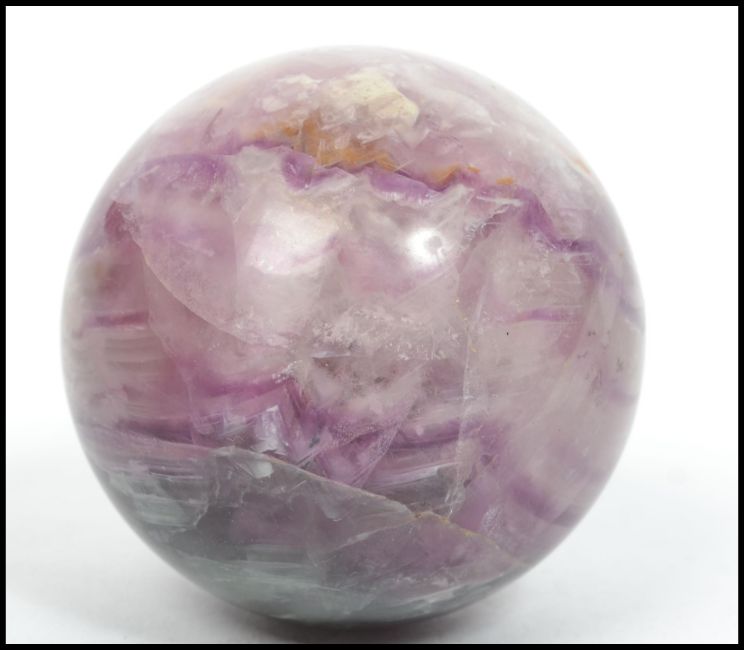 An unusual believed 20th century Blue John style ball / globe purple glass paperweight of colourful heavy form. Measures 7 cm diameter.