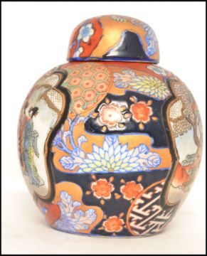 A 20th century Oriental Chinese ceramic ginger jar and lid decorated with floral sprays and white cartouche panels depicting domestic scenes, with four Ochre red character marks to base. Measures 15cms high.