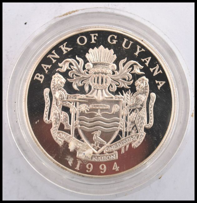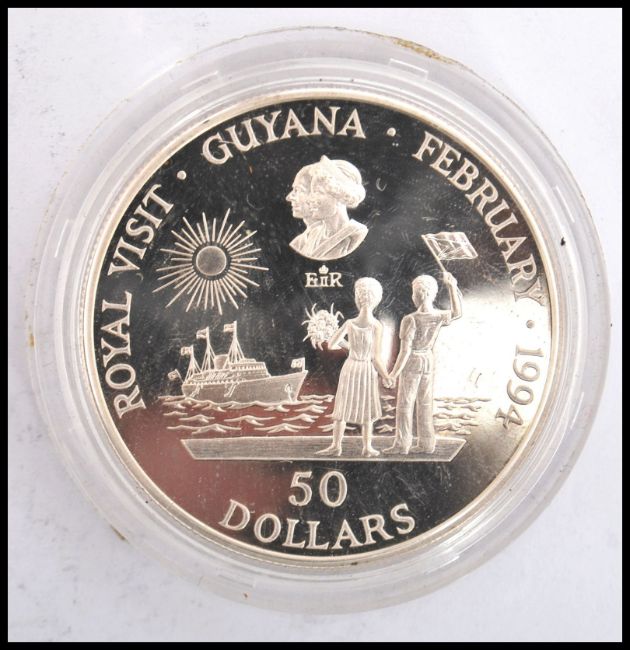 A Bank of Guyana silver proof $50 dollar coin to commemorate the Royal visit to Guyana in February 1994.