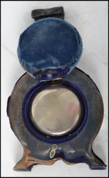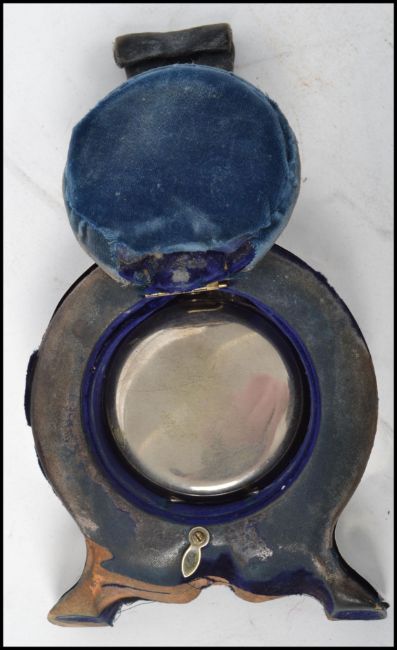 A silver hallmarked easel backed pocket watch stand of circular form with pocket watch having an enamel face with faceted hands and subsidiary seconds dial. AF hallmarks rubbed. Measures 14 cm high and 11 cm wide.