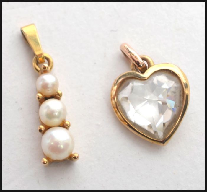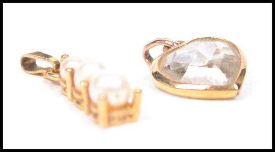 Two 9ct gold hallmarked pendants the first in the form of a heart with a mounted coloured cut crystal together with a cultured pearl pendant consisting of three graduating pearls with claw set mounting. Total gross weight 2.7g. Measures 2 cm long.