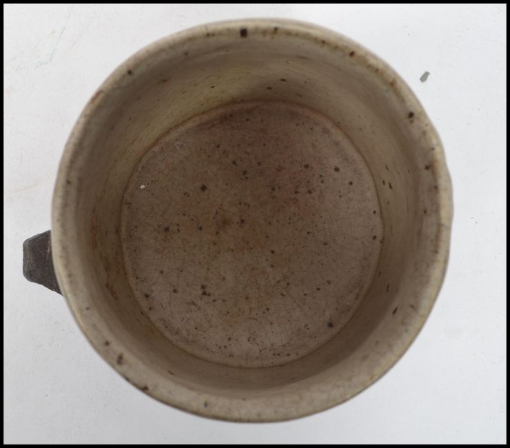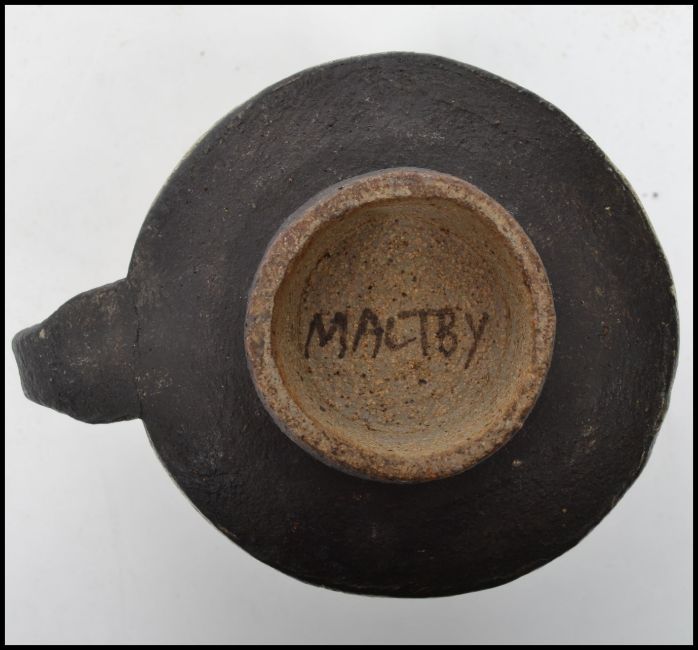 John Maltby (b.1936) A rare and unusual mid 20th century studio pottery cup having a small handle raised on a small circular foot with naive decoration. Signed MALTBY to base. Measures 13.5 cm high, 10.5 cm wide and 13 cm deep.