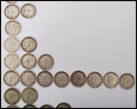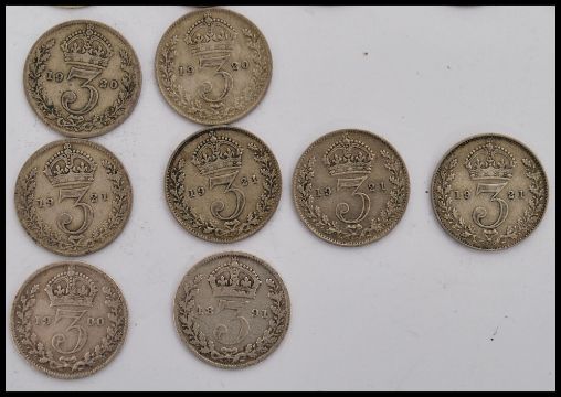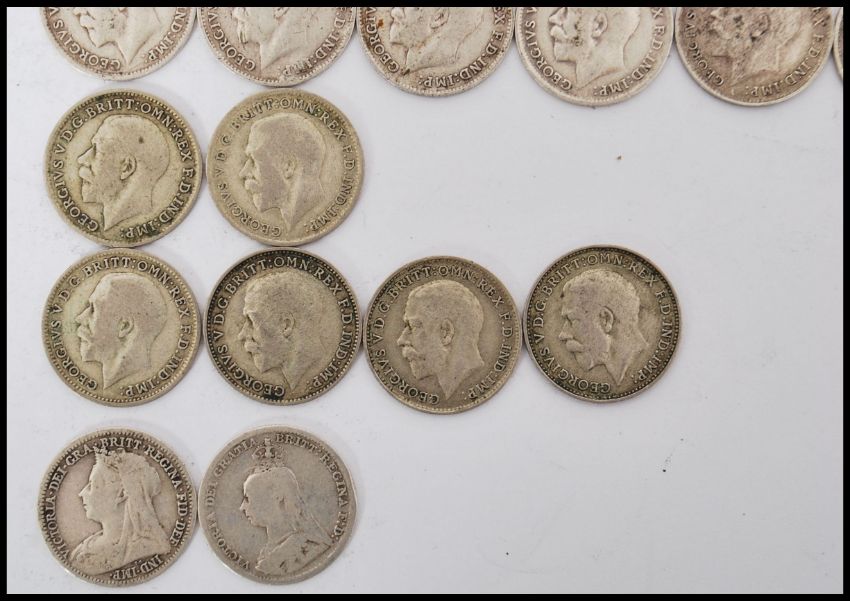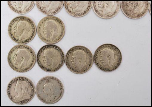 A collection of thirty silver three pence coins dating from the 19th century and the earlier part of the 20th century. Total weight 41g