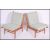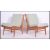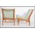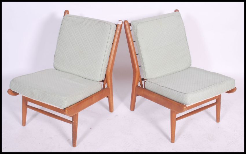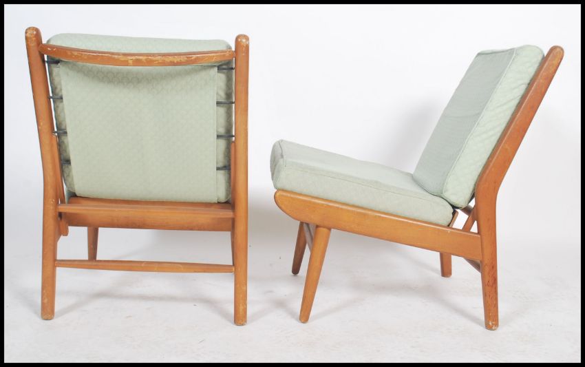 A fantastic pair of low Scandart armless easy chairs in stained beech having angular form. The cushions being in a pale green and laid on a bed of fabric covered springs , the chair having applied plaque for Scandart LTD. measures 74 x 52 x 70