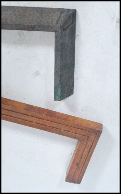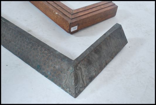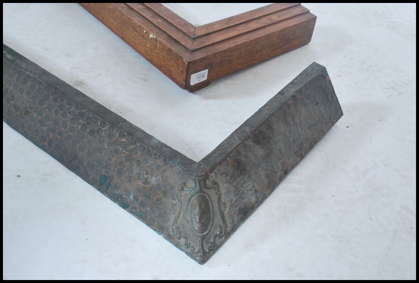 A vintage 20th century Arts and Crafts / Art Nouveau copper hand beaten fire fender together with a 1930's Art Deco oak stepped fire fender.  Measures: 8cm high x 115cm wide x 30cm deep.