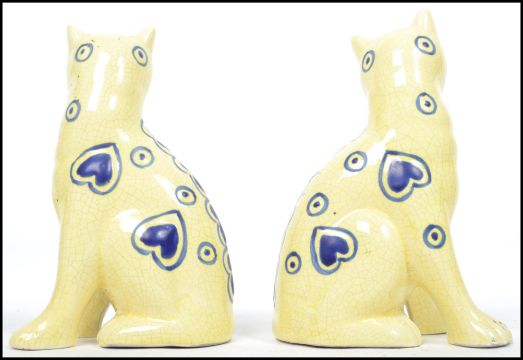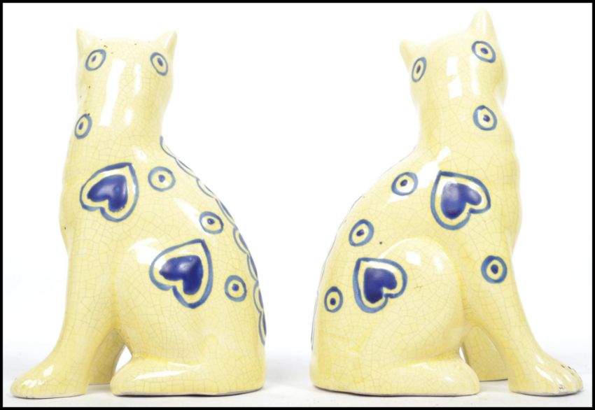 A pair of ( 2) 20th century French Galle style cats each with yellow and blue ground decoration with glass eyes. Measures 15 cm high, 8 cm wide and 10 cm deep.