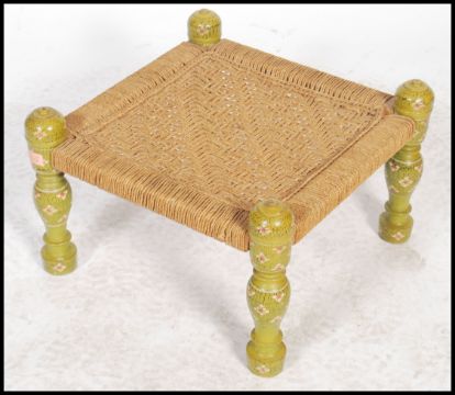 An early 20th century middle eastern Pakistani wooden foot stool of square form having a painted finish with rattan weave seat.