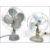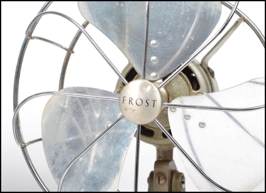 A mid 20th century vintage industrial electronic desk fan by H Frost & Co of Walsall, finished with a light blue enamel base with triple matching bladed face with guard. Along with another of similar form by Indola. Highest measures 43 cm.