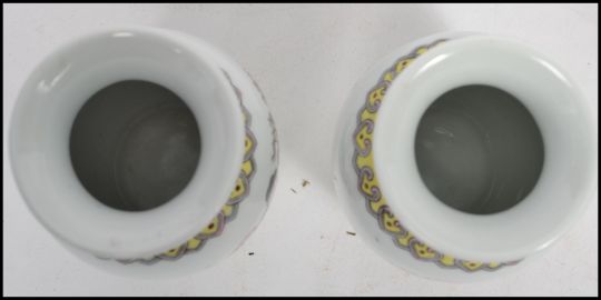 A pair of Oriental Chinese ceramic vases having waisted necks decorated with domestic scenes. Ochre red character marks to base. Measures 13 cm high.