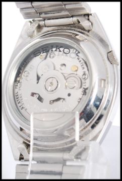 A vintage 20th century Seiko 5 gentleman's automatic wristwatch with day and date aperture, luminous hands and gilt tone baton numerals, on metal bracelet,