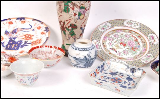 A collection of Chinese and oriental ceramics to include a famille rose salt glaze vase, square wucai dish, finger bowls, Imari pattern plates and other items etc. Tallest measures 31cms high.