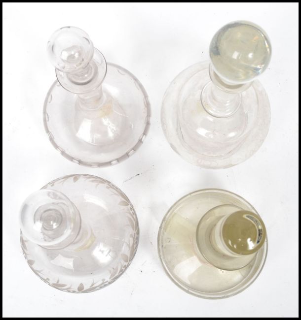 A collection of vintage decanters to include 3 19th century globe and spire, 2 with blown stoppers. Together with another acid etched example  (4 total ). Highest measures 31 cm.