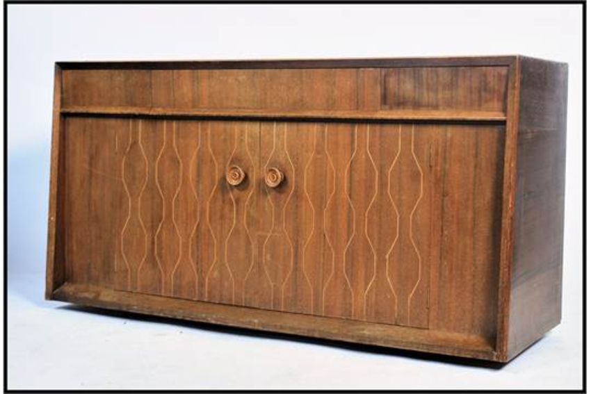 A mid century helix pattern sideboard possible by David Booth and Judith Ledeboer for Gordon Russell. The sideboard raised on plinth with stub feet having short drawers over cupboards with knob handles. 72 cm high x 141 cm wide x 50cm deep