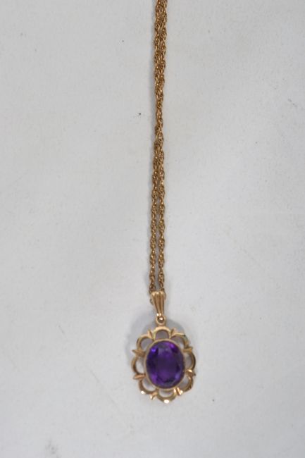 A 9ct gold 20" Prince of Wales chain, bolt ring fastener fitted with a 9ct gold hallmarked, oval amethyst pendant, large oval dark stone in milled setting. Total weight 5.8grms.